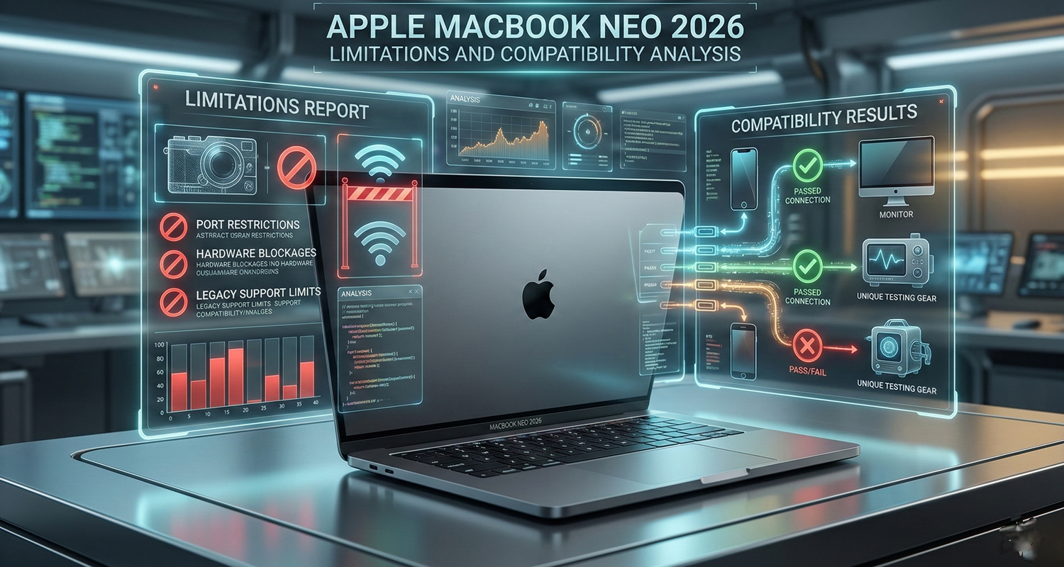 Research Report MacBook Neo Limitations and Compatibility Updated till Jan 2026 Apple introduced the MacBook Neo in early 2026 as its most affordable macOS laptop to date. The device targets the entry level market including educational institutions. Reaching this specific price tier required strict hardware compromises. The laptop uses the A18 Pro mobile processor instead of a desktop class M series chip. This introduces defined physical and software limitations. This report details the technical hardware limitations of the MacBook Neo running macOS Tahoe. We examine the A18 Pro processor constraints, input and output bottlenecks, and display technology downgrades. The data shows the device suits light administrative tasks but struggles with demanding multimedia workflows and high bandwidth peripheral connections. Check on Amazon Processor Topology and Computational Thresholds The MacBook Neo relies on an A series smartphone processor. The A18 Pro features a six core architecture. It has two high performance cores and four high efficiency cores. The chip handles single threaded tasks well. General applications launch quickly and web browsing is fluid. The limitations appear during multi core processing. Modern M series chips feature eight or ten cores. The six core A18 Pro slows down during parallel tasks like video rendering or large code compilations. The integrated graphics processing unit features five cores. This handles basic photo adjustments but lacks the graphical power for complex 3D environments. Performance Infographic: Single vs Multi Core Scoring Geekbench 6 estimates based on architectural averages. Scroll horizontally on smaller screens. Build Quality and Material Selection Apple uses recycled aluminum for the main exterior chassis. This lowers manufacturing costs while retaining physical strength. The device weighs exactly 2.2 pounds. It fits easily into small backpacks and standard shoulder bags. The display hinge feels rigid but lacks the smooth opening action found on heavier computer models. The bottom metal panel features four dense rubber feet to prevent sliding on flat desks. Apple replaced the traditional glass trackpad surface with a textured plastic composite. This plastic resists fingerprint oils but feels noticeably less smooth during multi finger gesture commands. Memory Bottlenecks and Capacities The device includes exactly eight gigabytes of unified memory. The memory is soldered directly to the processor package. Buyers cannot upgrade this capacity at purchase or after purchase. The macOS Tahoe operating system uses up to five gigabytes of memory immediately upon startup. The graphics processor and neural engine share the remaining available memory. The operating system actively uses the internal storage drive as swap memory to manage active applications. This frequent reading and writing degrades the total lifespan of the solid state drive. The processor also limits maximum memory bandwidth to 60 gigabytes per second. This restricts large data manipulation speeds. Storage Architecture and Transfer Speeds The base model includes a 256 gigabyte solid state drive. Apple configures this internal storage using a single NAND flash chip. This single chip configuration reduces read and write speeds by roughly forty percent compared to older dual chip designs. Copying large high resolution video files takes noticeably longer. The slower internal storage heavily impacts general system responsiveness when the computer uses swap memory. Desktop applications take an extra second to restore from the background when the main memory reaches maximum capacity. Users working with massive files will experience brief interface pauses during automatic background saving processes. Thermal Management and Acoustic Profile The MacBook Neo lacks an active cooling fan. It relies entirely on passive heat dissipation through the aluminum bottom plate. General web browsing generates minimal internal heat. The exterior remains cool to the touch during these light tasks. We compared the thermal throttling behavior against actively cooled laptops. Heavy workloads cause the A18 Pro to reduce its internal clock speed. This prevents internal damage from overheating. This thermal reduction lowers overall processing speed by up to thirty percent during extended tasks. Users running long software exports will notice significant slowdowns after ten minutes of continuous load. The device operates silently under all conditions due to the fanless design. Input and Output Connectivity The structural limitations of the mobile processor restrict external connections. The left side of the chassis holds two USB-C ports. These ports feature different performance parameters. The rear port supports USB 3 data transfer speeds up to 10 gigabits per second and external video output. The front port uses the older USB 2.0 standard. Data transfer on the front port is capped at 480 megabits per second. The device lacks a dedicated magnetic charging port. Charging the laptop using the rear high speed port leaves only the slow front port for data transfers. The processor does not support Thunderbolt protocols. Users cannot connect external graphics processing units. High speed docking stations fall back to slower connection modes. Typing Experience and Input Mechanics The physical input methods reflect the strict budget constraints. We compared the MacBook Neo keyboard against standard scissor switch designs. The key travel measures 1.0 millimeters. The lack of backlighting limits productivity in dim rooms. The keyboard also completely lacks Touch ID fingerprint recognition; users must type their password manually every time the device wakes from sleep. The mechanical trackpad requires physical movement to register a click. It does not use the solid state haptic feedback motors found in premium models. Users clicking near the top edge will feel significant physical resistance. Dragging and dropping files across th