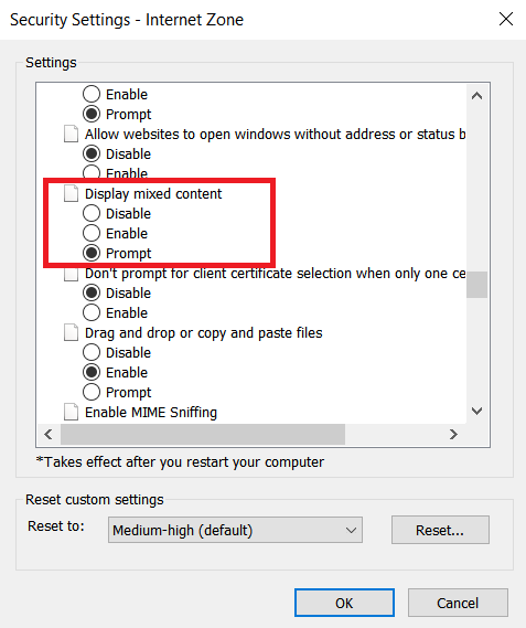 Consumer TechEnterprise TechTech PostsWindows How to Prevent “Only secure content is displayed” Message in IE July 2, 20166885 views0 Share By IG Share How to Prevent “Only secure content is displayed” Message in IE Sometimes, when you try to open certain webpages on the internet, you may prompted repeatedly a message that says “Only secure content is displayed”, which will require that you click on a button to “Show all content”. In this post, I am going to talk about how to prevent “only secure content is displayed’ in IE. Note: If you buy something from our links, we might earn a commission. See our disclosure statement. In order to prevent this message from appearing, follow any one of the following two methods to eliminate this message: Method 1 Add and ensure that the URL of the webpage is included in your Trusted sites list. Go to Tools -> Internet Options -> Security tab. Highlight Trusted Sites and click on the Sites button. Enter the Webpage URL and click the Add button, then the Close button. With Trusted Sites selected, click on the Customer Level button, scroll down to the Miscellaneous section, and in the option titled “Display mixed content” choose the Enable option. Click OK, then OK again Method 2 Go to Tools -> Internet Options -> Security tab. Highlight Internet and click on the Custom Level button. Scroll down to the Miscellaneous section – in the option titled “Display Mixed Content” choose the Enable option (see below). Click OK, then OK again. It is always advisable to do the following steps if things are not getting resolved: Clear your IE cookies/history and try to open the webpage to check if the frequent crashes are persisted. Check and test on remote desktop where the webpage is opening without add-ons but crashes are persisted. Try uninstalling and reinstalling IE and try. If still issue comes again, Put the IE on compatibility (pressing F12 key) mode and check. I hope that solves the issues with displaying secured content. Affiliate Disclosure: Faceofit.com is a participant in the Amazon Services LLC Associates Program. As an Amazon Associate we earn from qualifying purchases. Share What's your reaction? Excited 0 Happy 0 In Love 0 Not Sure 0 Silly 0