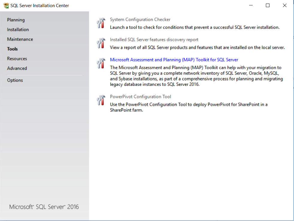 On the Tools menu, you have a lot of standalone tools included in the package. For example, MAP toolkit, PowerPivot configuration tools for SharePoint 2016 on-premises. SharePoint 2013 is not compatible with SQL Server 2016 at the time of writing this post.